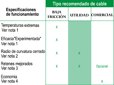 NOTA 3. - Los cables de BAJA FRICCIÓN y UTILIDAD están disponibles, sin precio adicional con los rascadores Modelo 5 Mejorado, o Modelo 6. Los cables grado COMERCIAL se suministran con rascador plástico. Modelo 5 Mejorado y Modelo 6 están disponibles con precio adicional. |